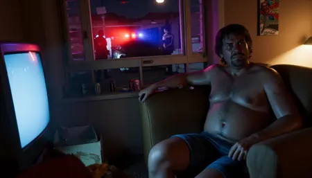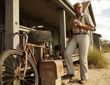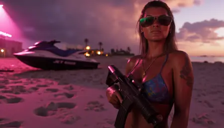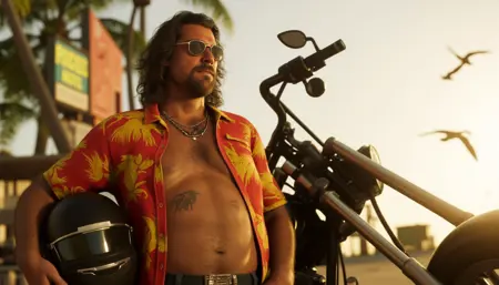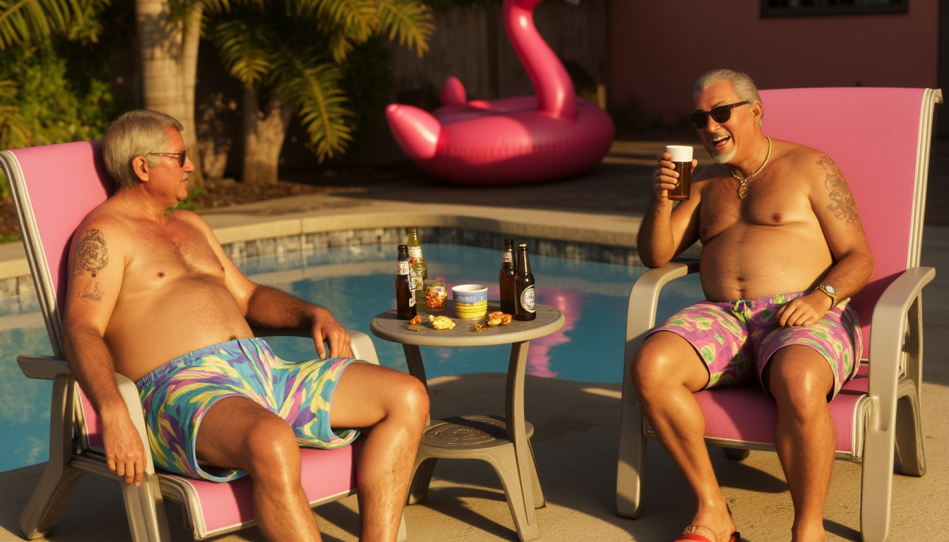 例如: "gtaillvi style of 两位年长男子坐在后院花园的躺椅上,旁边有一个小型游泳池。他们赤裸上身,穿着彩色短裤、凉鞋和太阳镜,每人手中都拿着一杯冰啤酒。一张圆形塑料桌上放着更多瓶装饮料和小吃。其中一人手臂有纹身,戴着金链,另一人笑着露出缺牙。花园周围是棕榈树和粉色围墙,泳池中漂浮着一只火烈鸟浮具。温暖的日落光线,放松的氛围,电影般的构图。"