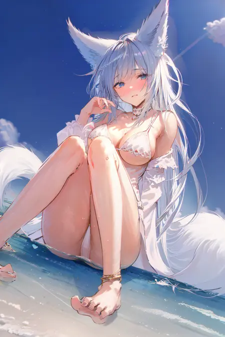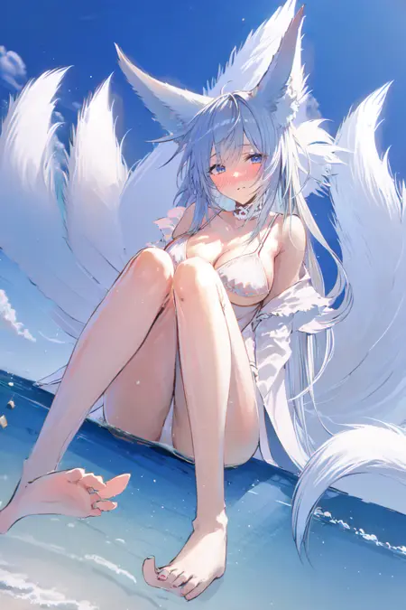 -->プロンプト:fluffonwater, animal ear fluff, animal ears, bare shoulders, barefoot, beach, bikini, feet, fox ears, fox girl, fox tail, kitsune, kyuubi, large tail, long hair, multiple tails, sitting, blushed, lewd face, red face, soles, swimsuit, tail, water, white bikini, white tail,