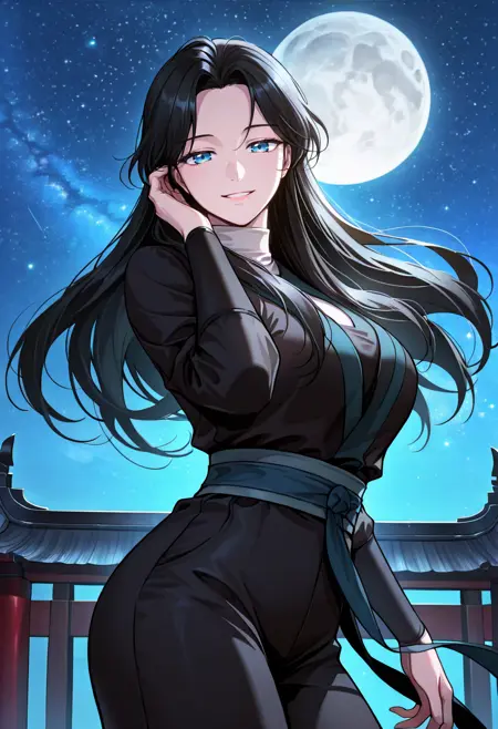 Moon Gyu, black hair, long hair, blue eyes, parted bangs, curtained hair, ponytail,