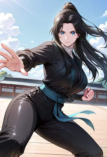 chinese clothes, white turtleneck, black shirt, long sleeves, blue sash, black pants