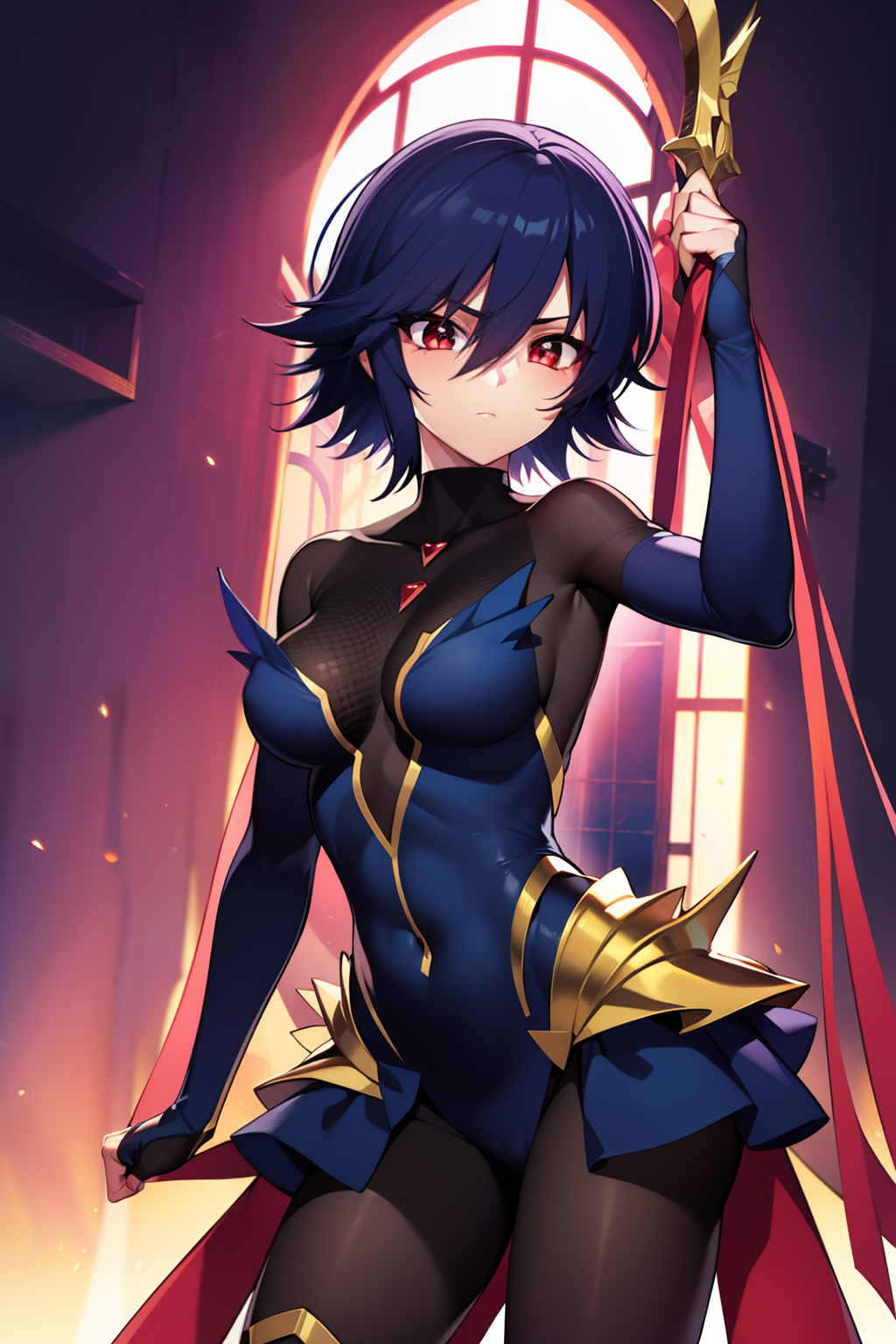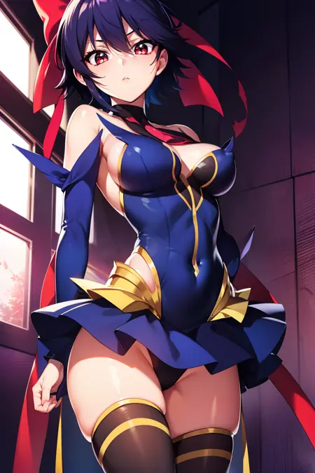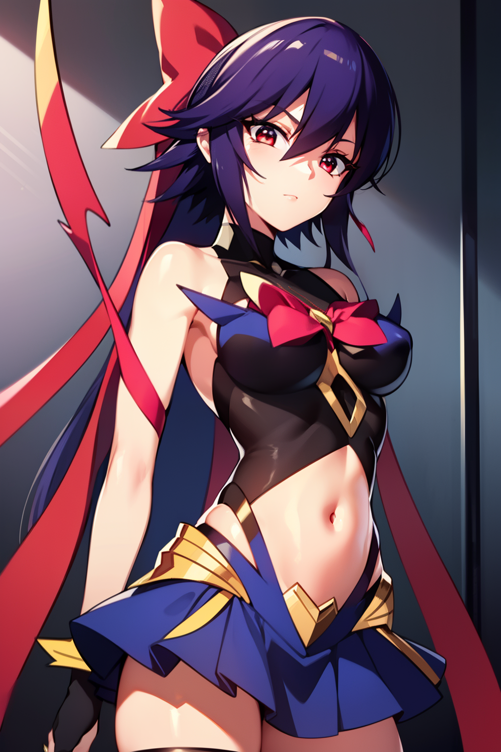触发词: KaganoAI,红眼睛,紫色头发,短发,侧发,红色丝带,蓝色魔法少女,金色饰品,裸露肩膀,(蓝色裙子:1.2),蓝色肘部,黑色过膝袜,乳沟