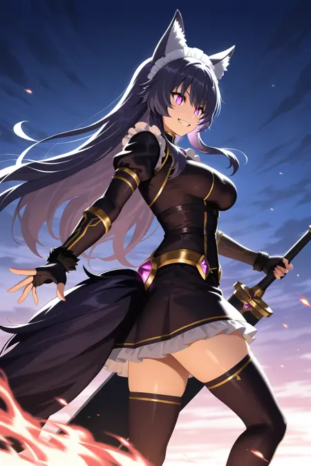 delta \(kage no jitsuryokusha ni naritakute!\), 1girl, 紫色眼睛, 动物耳朵, 单人, 尾巴, 长发, 狼尾, 狼耳, 露胸剪裁, 衣服剪裁, 狼女, 手套, 动物耳朵绒毛, 毛皮镶边, 连体衣,