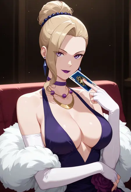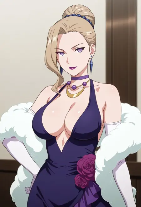 blonde hair,hair bun,purple eyes,lipstick,necklace,earrings, choker, purple dress.elbow fingerless gloves, feather boa,