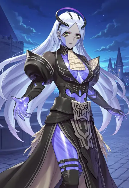 Basic prompt: ganglot_(fire_emblem), 1girl, long hair, white hair, green eyes, see-through body, purple skin, black lips, medium breasts, black dress, belt, tiara, ascot, see-through clothes