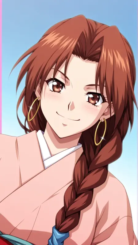 외모: 갈색 눈, 갈색 머리, 땋은 머리, 단일 땋은 머리, 보석, 긴 머리, 고리 귀걸이, 어깨 위로 흐르는 머리,