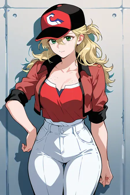kay nimrod, freckles, green eyes, brond hair, long hair, jacket, cap, pants