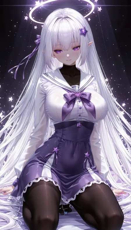 基础:xiabubu, white hair, long hair, very long hair, purple eyes, flower, hair flower, pointy ears, large breasts, star symbolsymbolsymbol, purple star ornament, hair between eyes,