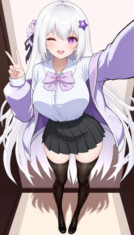 Official attire:white sailor collar,sailor collar,white shirt,bow,collarbone,covered collarbone,purple bow,school uniform,serafuku,heart,white sailor collar,black footwear,off shoulder,black pantyhose,covered navel,frilled skirt,loafers,purple bow,high-waist skirt,purple skirt,thighband pantyhose,purple ribbon,purple bowtie,