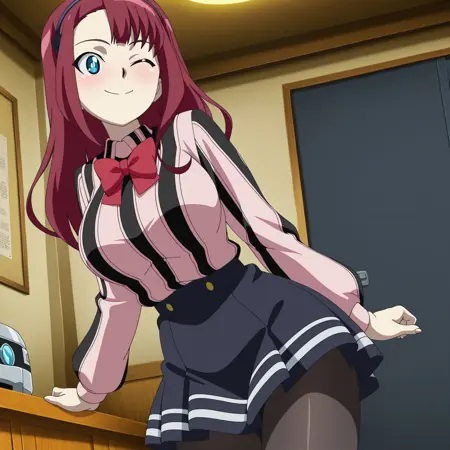 use tags like "beyblade, cristina kuroda, kristina kuroda, long hair, blue eyes, hairband, red hair, pantyhose, bowtie, skirt,long sleeve