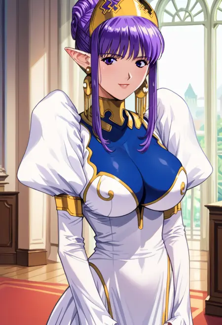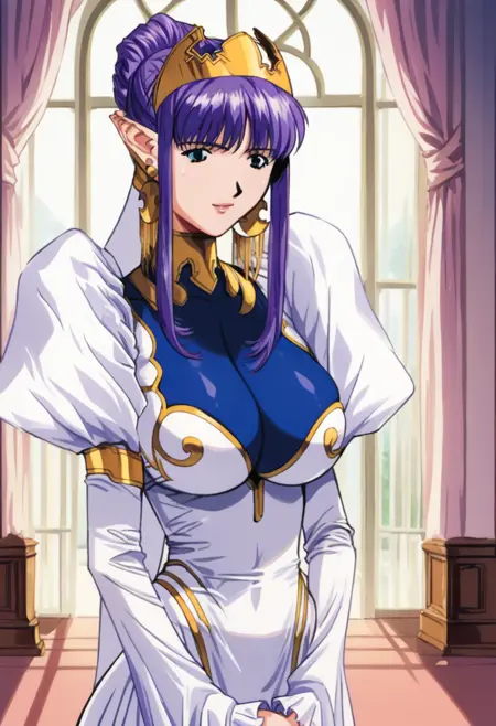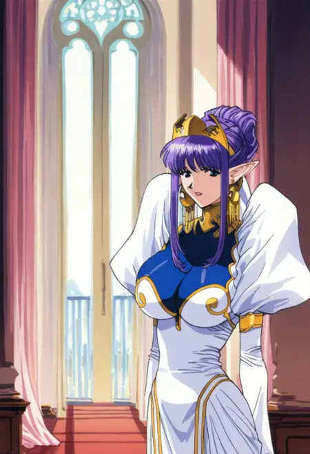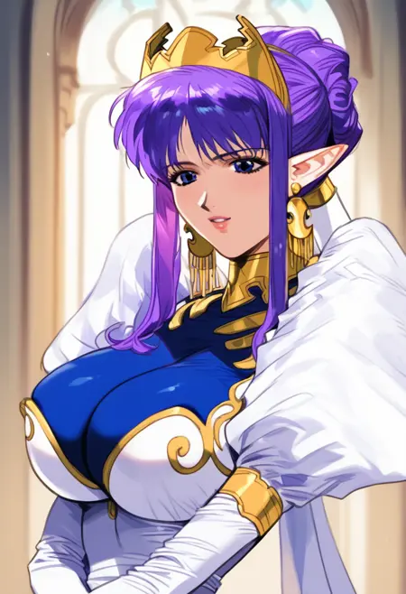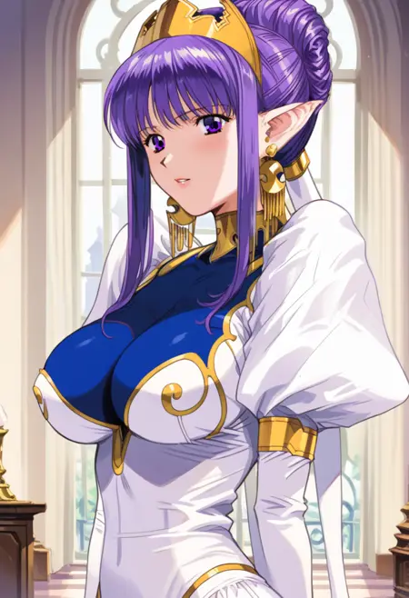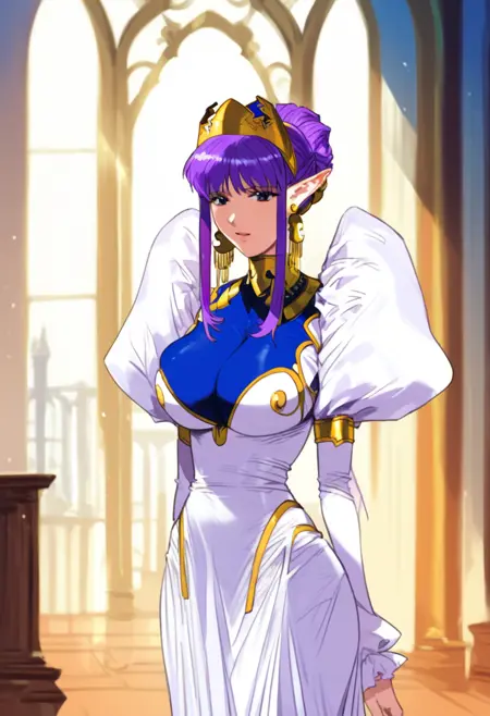 触发词:julietta_pony,紫色头发女性,尖耳女性,大乳房,珠宝,侧发,长发,耳环,蓬松袖子,长袖,裙子
