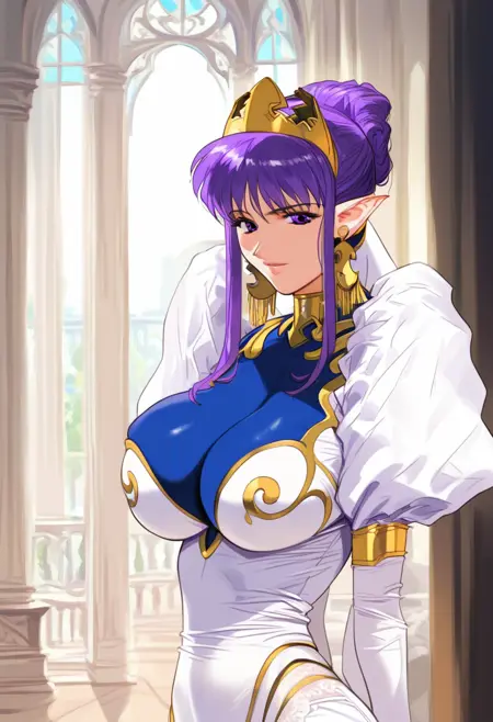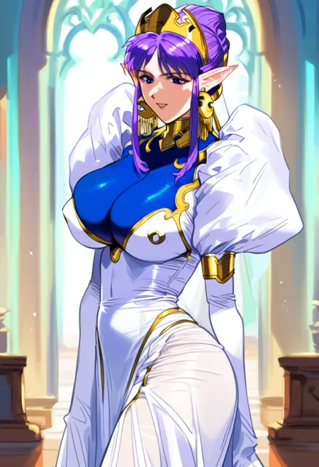 Trigger: julietta_pony, purple hair female, pointy ears female, large breasts, jewelry, sidelocks, long hair, earrings, puffy sleeves, long sleeves, dress