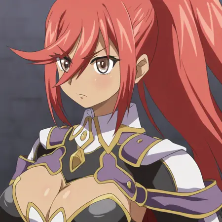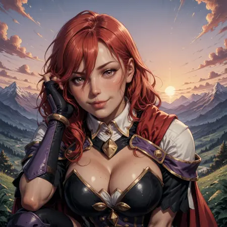 トリガーワード: LaHire、赤髪、茶色の目、ポニーテール、カラー、鎧、胸元、フィンガーレスグローブ、赤いマント、シンハイズ