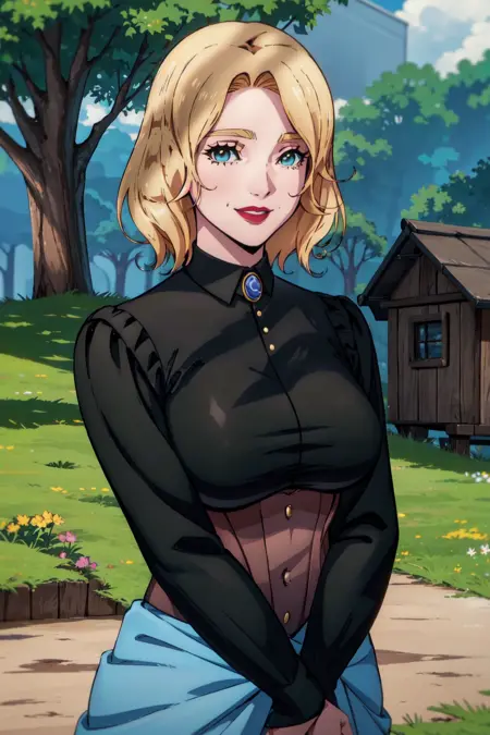 tera, mature female, 1girl, blonde hair, green eyes, short hair, red lips.이전 버전: