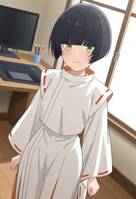 shinobu_honosaka,1girl,solo,黒髪,短髪,ボブカット,緑目,学校制服,ブレザー,茶色のジャケット,長袖,赤いネクタイ,白シャツ,カッターシャツ,茶色のスカート,プリーツスカート,黒の靴下,靴,茶色の靴,ローファー,
