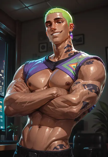 トリガー単語: ゲッコー、短髪、緑の髪、茶色い目、濃い肌、タトゥー