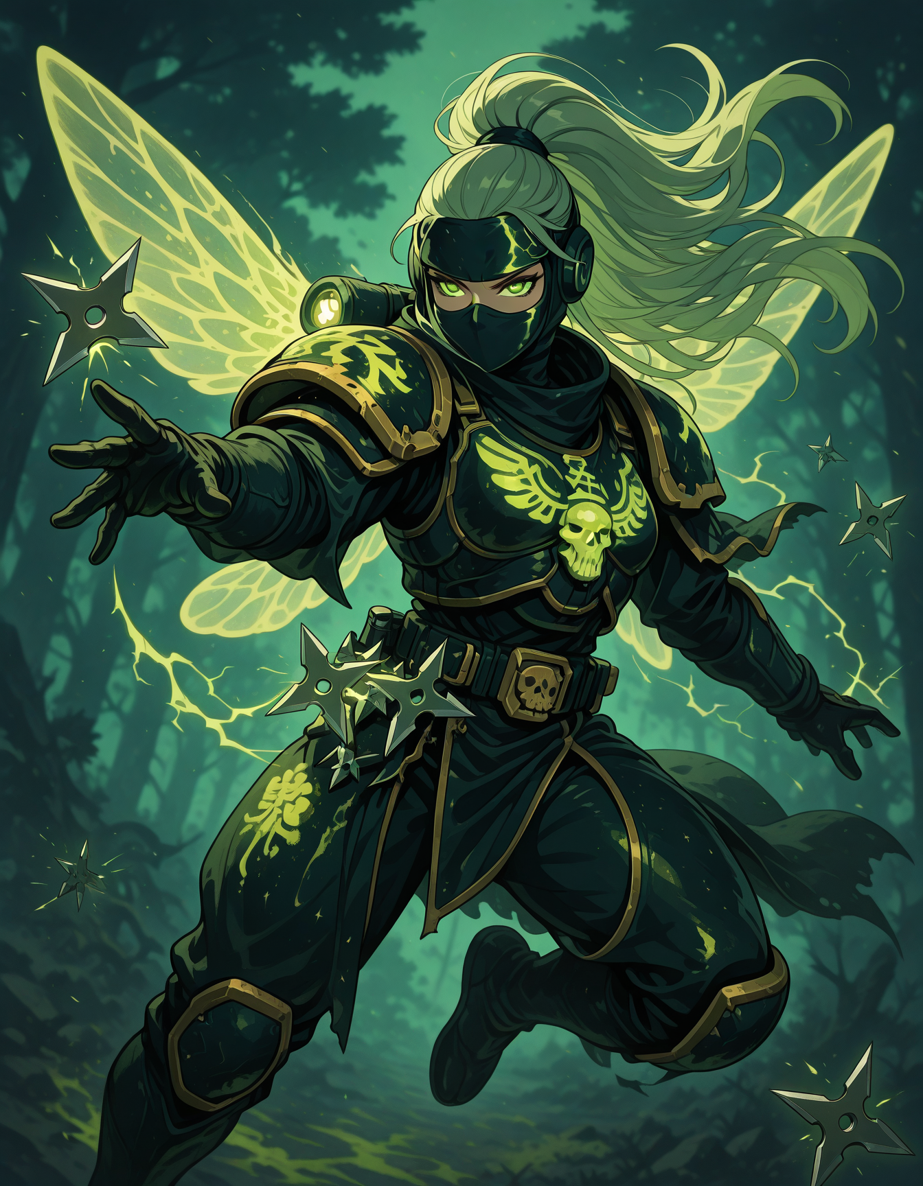 "Flatline, Flat vector illustration,,masterpiece, best quality, good quality, very aesthetic, absurdres, newest, 8K, depth of field, focused subject, dynamic close up angle, close up, beautiful elf princess, beautiful face, glowing eyes, wearing a beautiful dress with details, big breasts, beuatiful female face features, dynamic close up pose, green electricity sparks, throwing green glowing shuriken, shurikens if flying through the air, holofoil glitter, faint, glowing, ethereal wings, white hair flowing in wind, white black hair, otherworldly glow, magical forest in background"