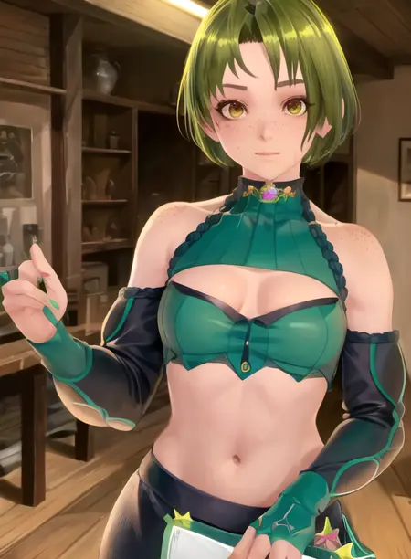 ryumivt, short hair, green hair, yellow eyes, crop top, green nails, detached sleeves, freckles, brown eyes