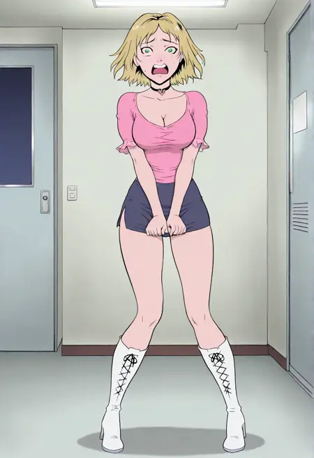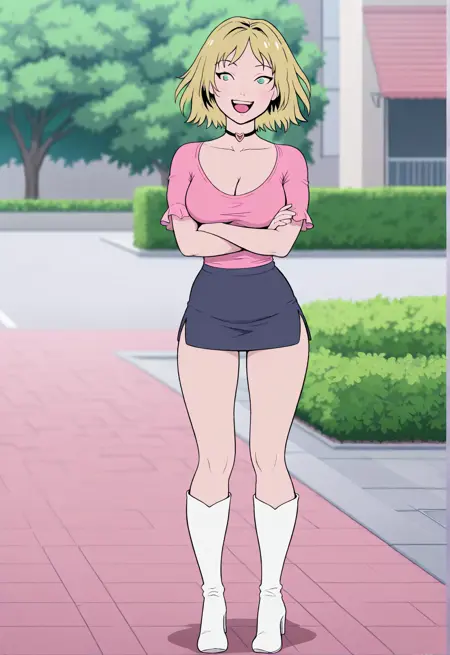 The mail order bride from Chechnya summoned to be put into a polygynous marriage with a slobbish American and a giant talking drink cup. She thankfully escaped. Main prompt is "SvetlanaATHF" along with "short hair,blonde hair,green eyes". For her clothes "pink shirt,short sleeves,miniskirt,white boots,heart choker".