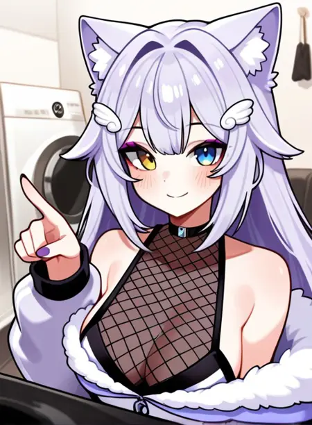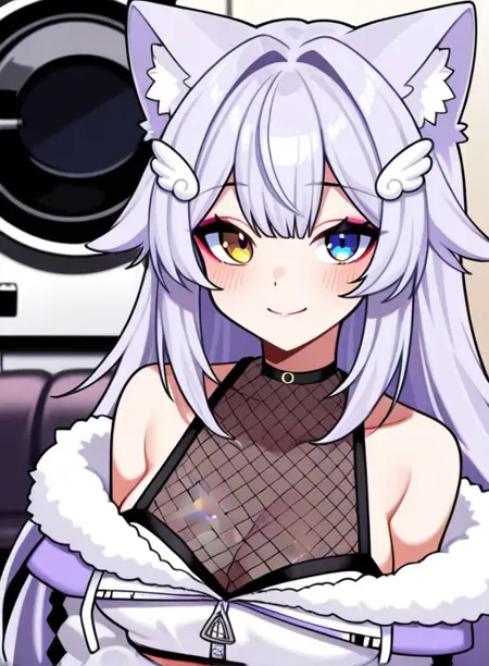 ネプチューネ、長い髪、胸、青い目、大きい胸、髪飾り、動物の耳、黄色い目、灰色の髪、紫の髪、バーチャルユーチューバー、髪止め、猫の耳、ネイルポリッシュ、動物の耳のふわふわ、化粧、虹彩異色症、猫娘、アイシャドー、翼型の髪飾り、中くらいの胸、髪の流れ
