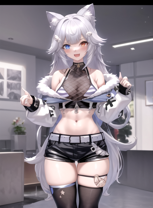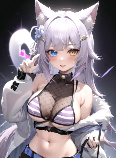 Nephtunie, long hair, breasts, blue eyes, large breasts, hair ornament, animal ears,, yellow eyes, grey hair, purple hair, virtual youtuber,, hairclip, cat ears, nail polish, animal ear fluff,makeup, heterochromia, cat girl,, eyeshadow, wing hair ornament, medium breasts,hair intakes,