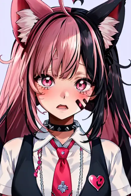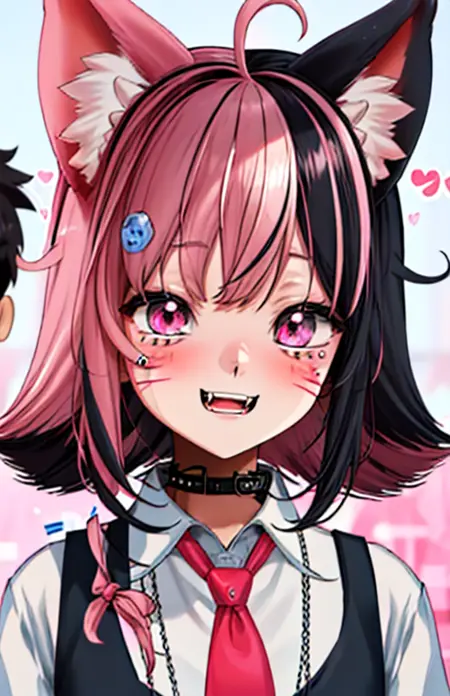 suwie, pink hair, multicolored hair, black hair, animal ears, pink eyes, cat ears, two-tone hair, bangs