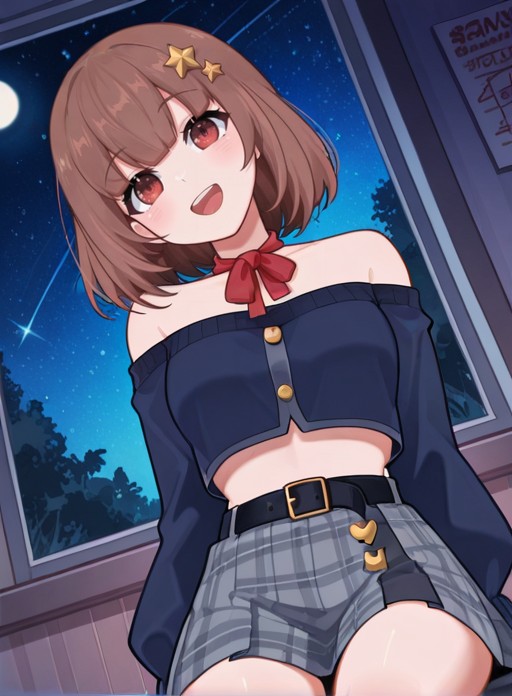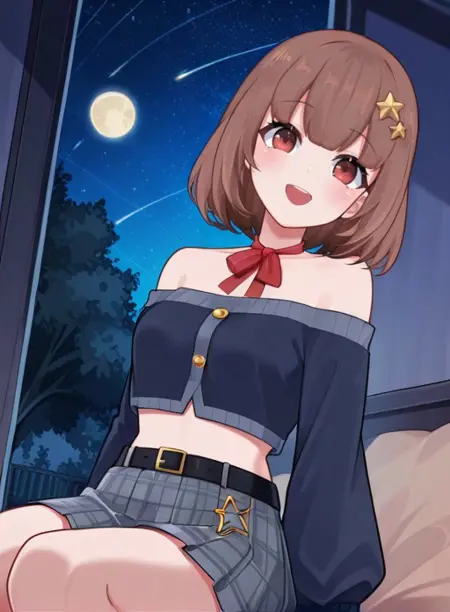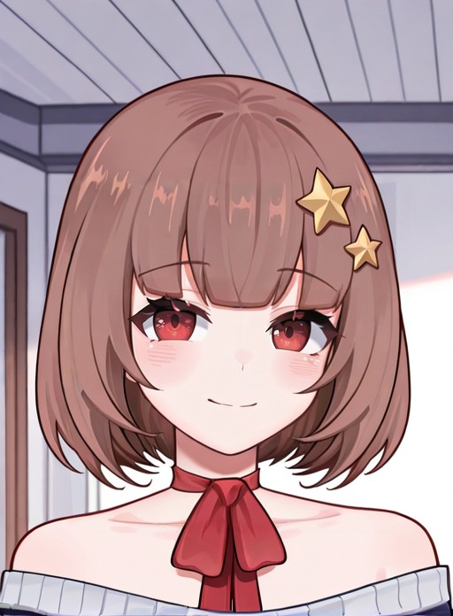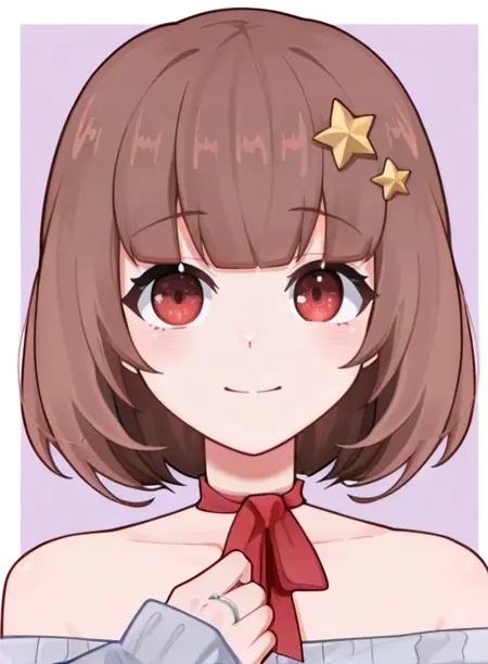 StarVtuber,1个女孩,单独,短发,棕色头发,发饰,红眼睛,虚拟YouTuber,中等长度头发,手举起,齐刘海,露肩,星(符号),鲍勃头,星形发饰,