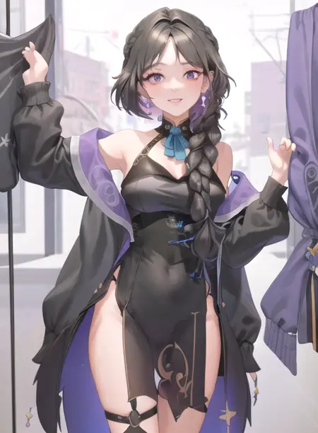 elure, braid, purple eyes, grey hair, long hair, dress, bangs, jacket