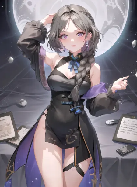 ElureVT,长发,乳房,紫色眼睛,灰发,发辫,紫发,多色发,耳环,虚拟YouTuber,眼下痣,新月,内层彩色发,妆容,短发,长辫子,