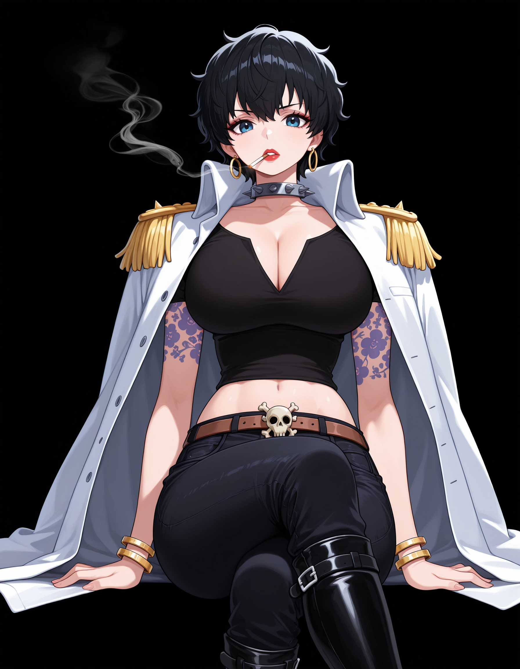 해군 코트 착용 시: 검은 크롭탑, 짧은 소매, 가슴 노출, 청바지, 검은 바지, 갈색 벨트, 해골 버클, 검은 부츠, 무릎 부츠, 긴 흰 코트, 어깨장식, 어깨에 코트, 금팔찌