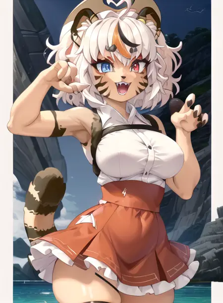 CherryToragao, 1girl, solo, breasts, blue eyes, large breasts, black hair, red eyes, animal ears, tail,white hair, ahoge, multicolored hair, heart, teeth, virtual youtuber, orange hair, streaked hair, heterochromia, fangs, thick eyebrows, black nails, bright pupils, furry, claws, white pupils, furry female, body fur, tiger ears, animal nose, tiger tail, heart ahoge, brown fur, tiger girl, medium hair,orange skin, dark nipples