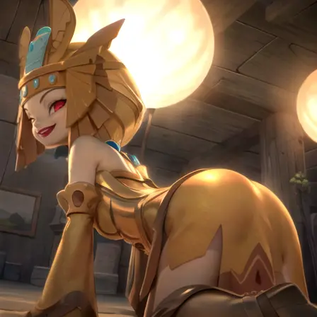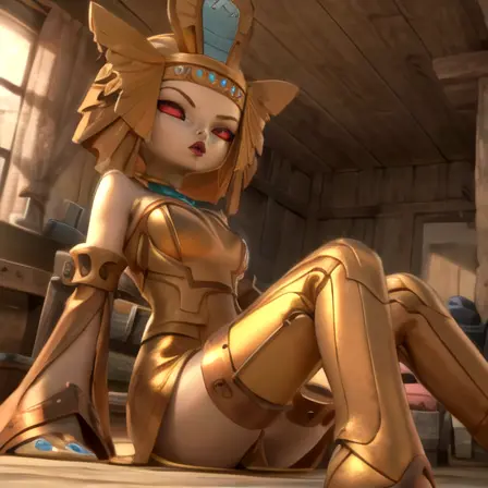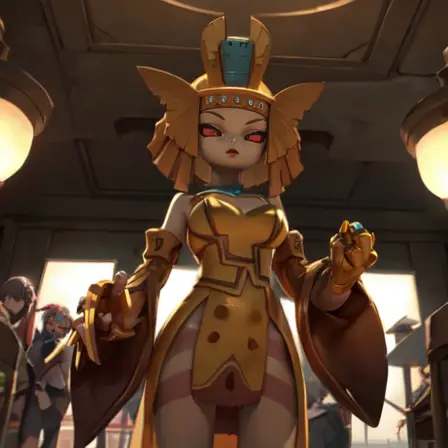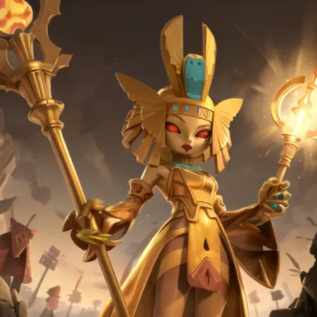 다음 태그로 시작하세요: Golden Queen, 1girl, solo, solo focus, staff, holding staff, red eyes, colored skin, gold, detached sleeves