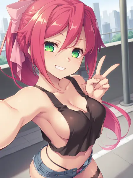 외모: 쿠로이리스, 빨간 머리, 긴 머리, 포니테일, 녹색 눈, 중간 크기의 가슴, 분홍색 머리 리본