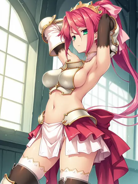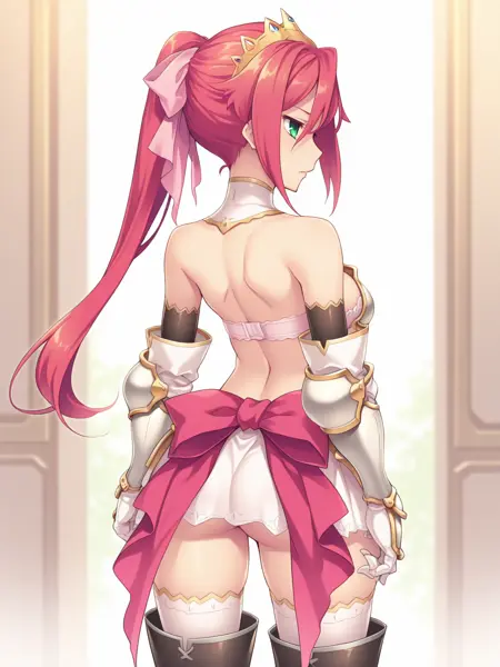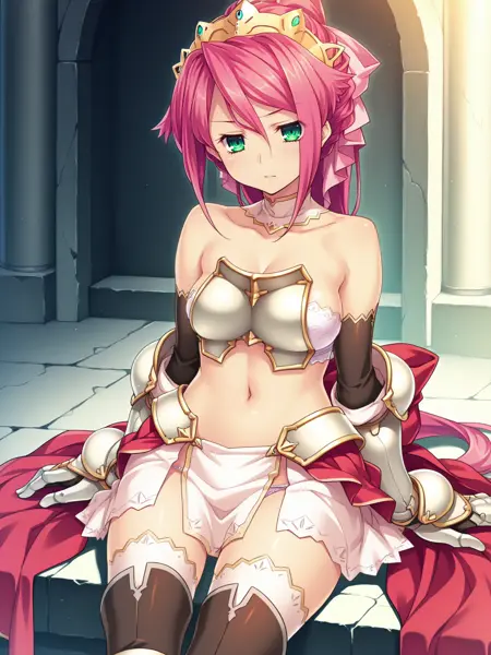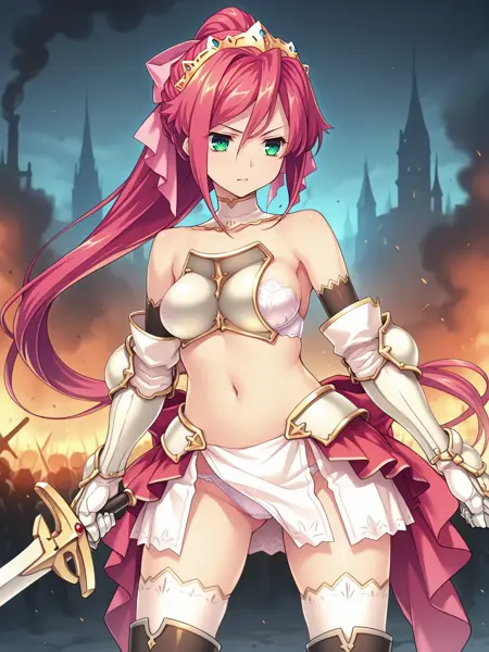 복장: 왕관, 갑옷 드레스, 가슴판, 배꼽, 흰색 브라, 스트랩리스 브라, 흰색 치마, 팬티 라인, 빨간색 허리 뒤 리본, 팔꿈치 장갑, 검은 장갑, 흰 장갑, 계층적 장갑, 겐틀릿, 흰색 허벅지 양말, 허벅지 부츠, 검은 부츠, 갑옷 부츠, 계층적 부츠, 종아리 보호대, 흰색 칼라