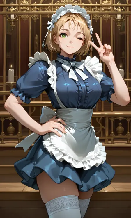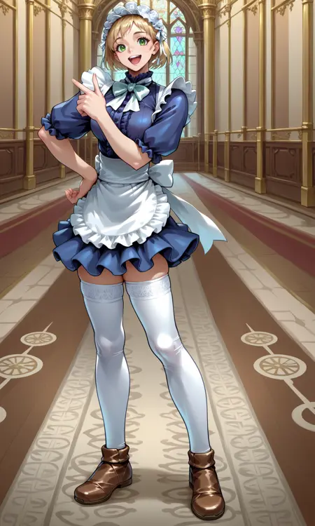 [기본 복장]: 금발, 단발, 녹색 눈, 메이드 헤드장식, 흰색 리본 넥타이, 파란색 드레스, 부푼 짧은 소매, 중간 크기의 가슴, 프릴, 허리 앞치마, 흰색 허벅지 양말, 갈색 신발