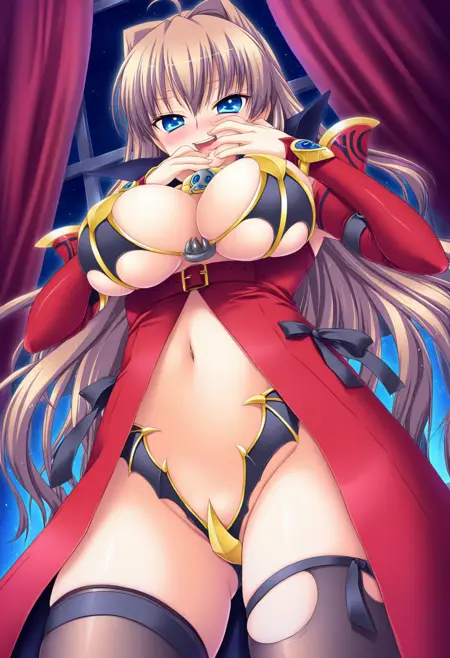 Clothing: gold collar, red coat, bikini armor, clothing cutout, detached sleeves, black ribbon, black thighhighs,
