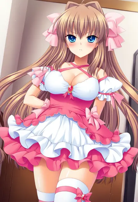 Clothing: pink short dress, criss-cross halter, red brooch, white thighhighs,
