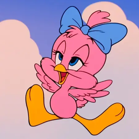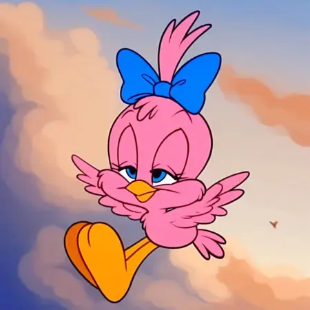 Tags: sweetie bird, solo, semi-anthro, cute, 1girl, sweetie_bird_tiny_toons, pink feathers, yellow beak, light blue bow, light blue bow on head, pink head tuff, yellow legs, blue eyes, pink arms, pink wings,