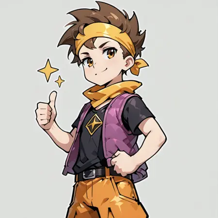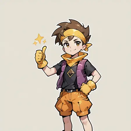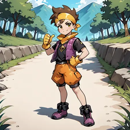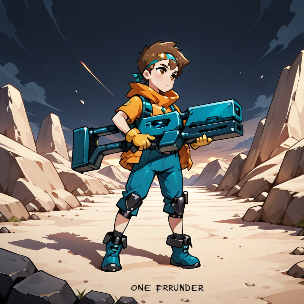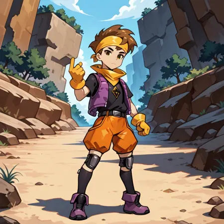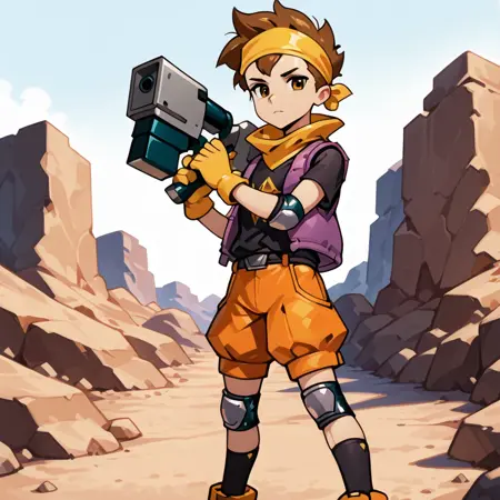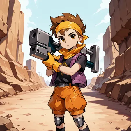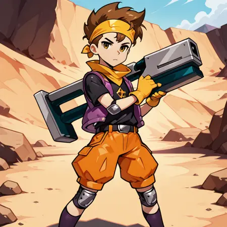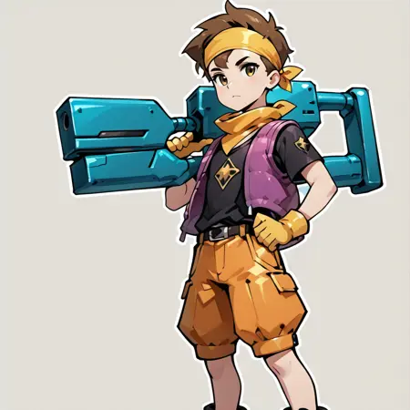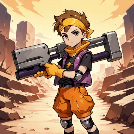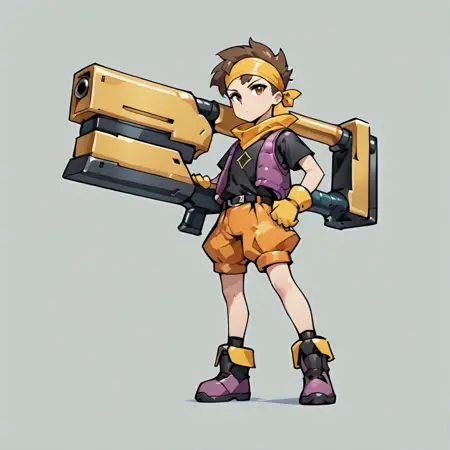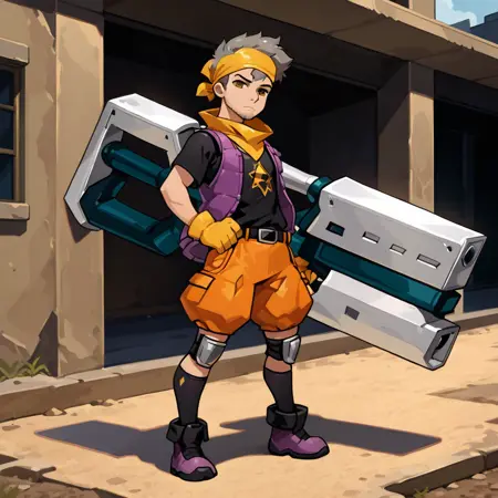 OneStepFromEdenGunner, 1boy, solo, brown_hair, black_shirt, orange_shorts, short_hair, yellow_bandana, purple_vest, yellow_gloves, kneehighs, knee_pads, two_handed, HUGE GUN, holding weapon