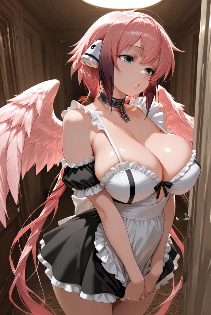 1girl, ikaros, pink hair, gradient hair, green eyes, hair between eyes, twintails, multicolored hair, sidelocks, angel wings, pink wings, bare shoulders, broken chain, feathered wings, navel, pleated skirt, skirt, thighhighs, white skirt, zettai ryouiki