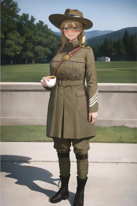 除了維多利亞時代的英國龍蝦兵redcoat、victorianera,也可以用ww1era、khaki uniform等關鍵字來生成一次大戰風格的土色英軍制服。根據peaked cap,ANZAC,slouch hat,cowboy hat,ufo helmet等詞就可以叫出不同服裝與殖民地風味。