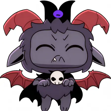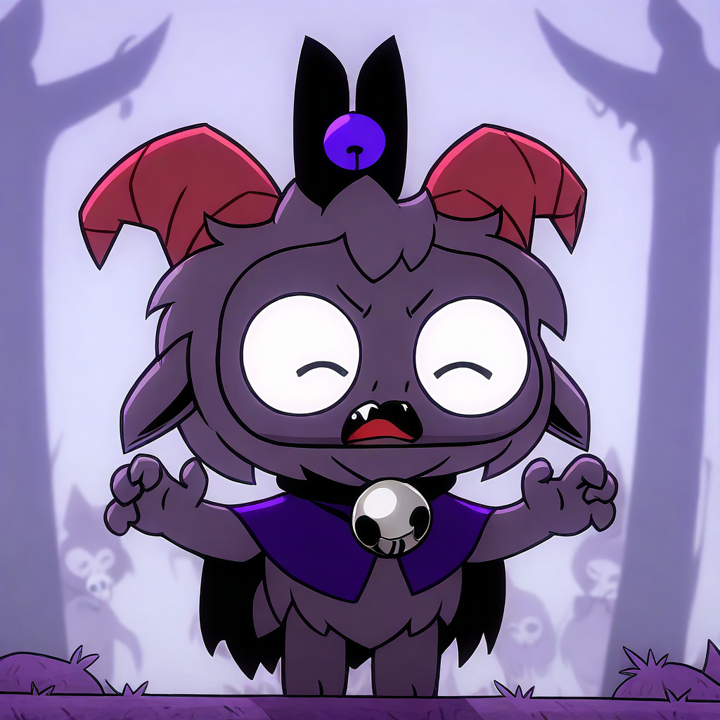 goat, anthro, large horns, grey skin, black hair, no iris, black pupils, horizontal pupils, droppy ears, silver bell, purple cape