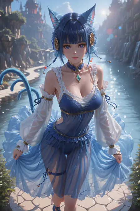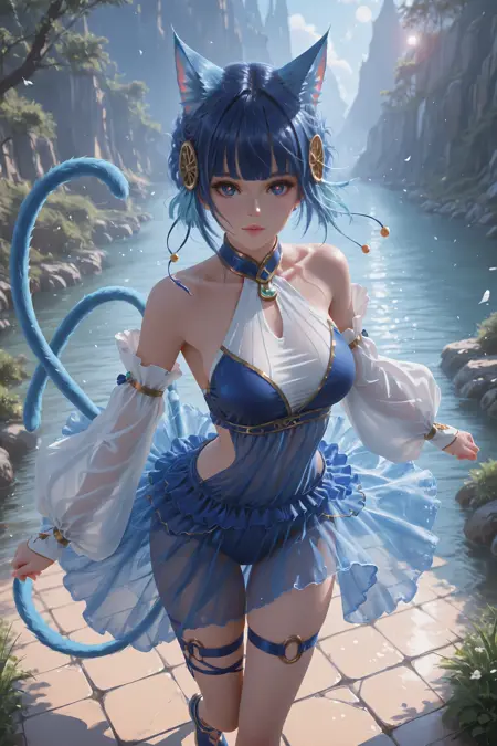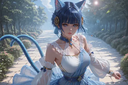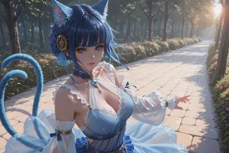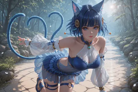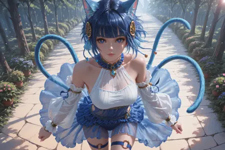 Ni-Ni the Mirror Mikanko,animal ears,cat ears,blue eyes,cat tail,blue hair,side cutout,covered navel,white dress,hair ornament,elbow gloves,bare shoulders,thigh strap,cat girl,jewelry,strapless,short dress,strapless dress,earrings,white footwear,detached collar,bridal veil,clothing cutout,puffy long sleeves,midriff,see-through,long heel,long legs