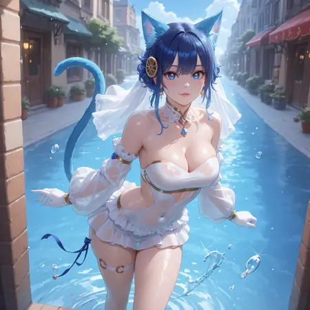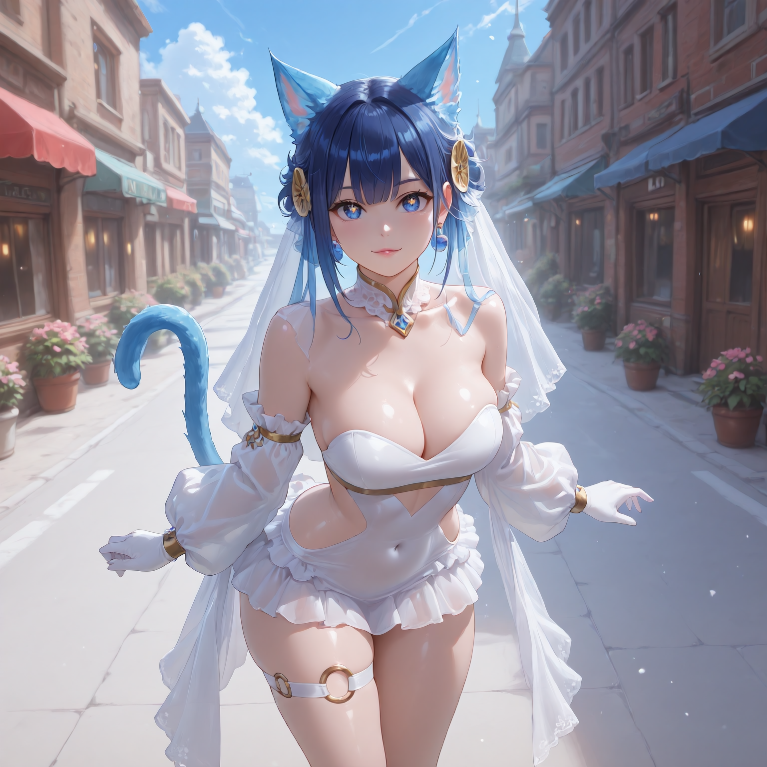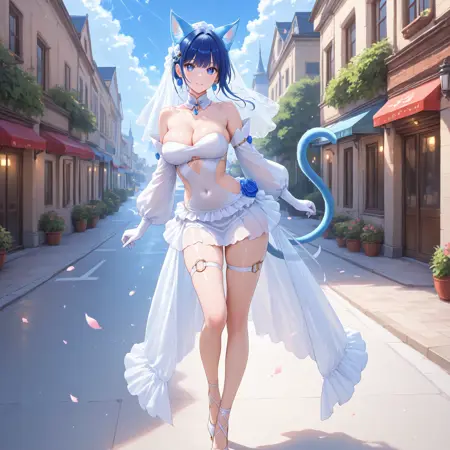 Ni-Ni the Mirror Mikanko,animal ears,cat ears,blue eyes,cat tail,blue hair,side cutout,covered navel,white dress,hair ornament,elbow gloves,bare shoulders,thigh strap,cat girl,jewelry,strapless,short dress,strapless dress,earrings,white footwear,detached collar,bridal veil,clothing cutout,puffy long sleeves,midriff,see-through,long heel,long legs
