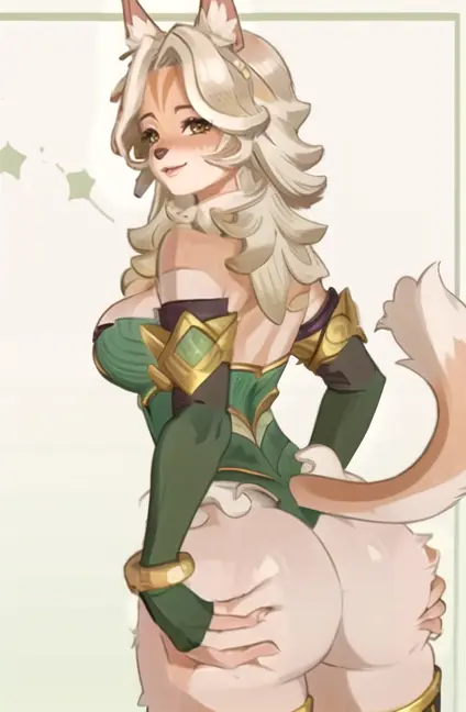 更多标签以确保获得完整的Lenya形象:_1girl, solo, breasts, furry, animal ears, furry female, gloves, bare shoulders, smile, cat ears, animal ear fluff, cat girl, large breasts, tail, body fur, medium hair, cleavage, fingerless gloves, jewelry, thighhighs, detached sleeves, green leotard, strapless