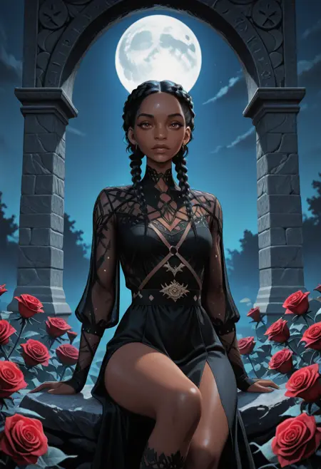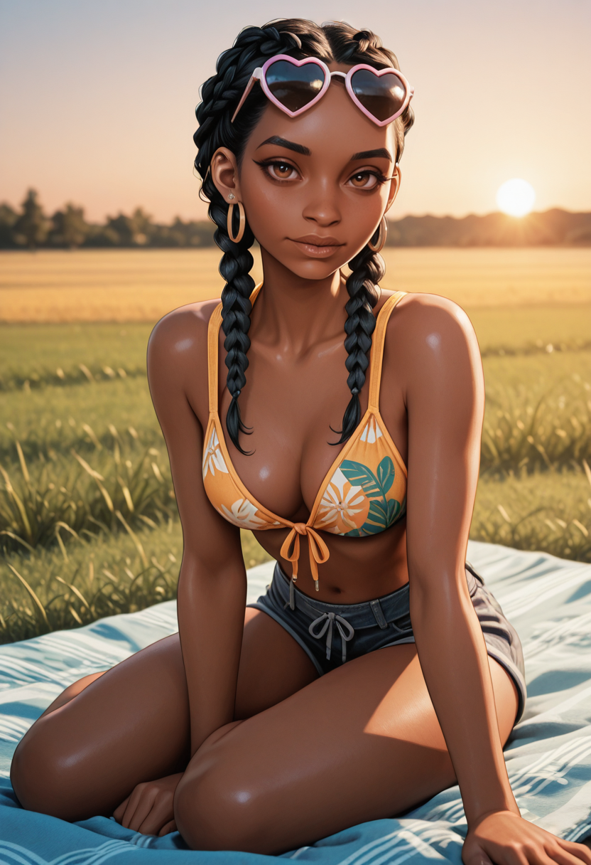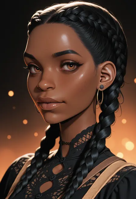 SOMHazel, 1girl, black hair, long hair, twin braids, brown eyes, dark skin, earrings