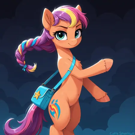 pony, earth pony, green eyes, body peach skin tone, pony wears a blue shoulder bag, mane and tail are purple, with bright rainbow stripes on the top of the mane and in the tail, The tail is braided, purple hooves