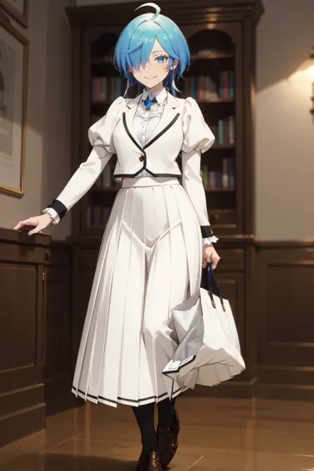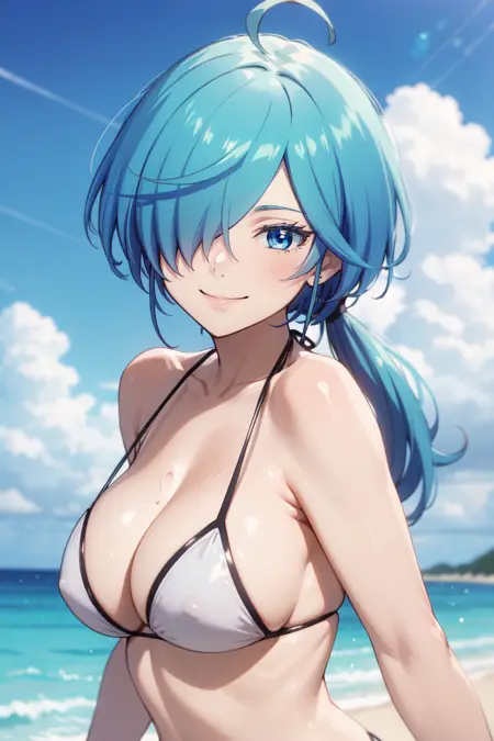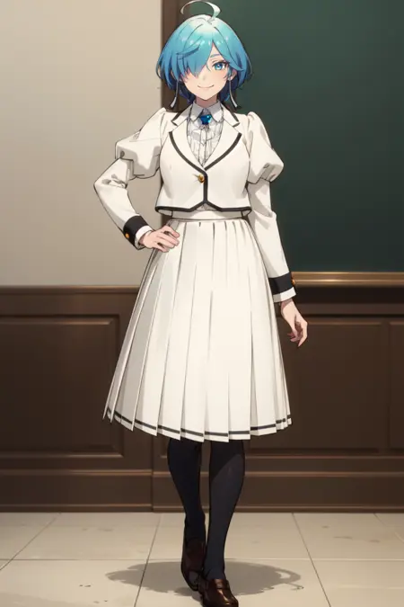 外見:片目に髪をかけた、青い目、青髪、低いポニーテール、あほ毛、背の高い女性