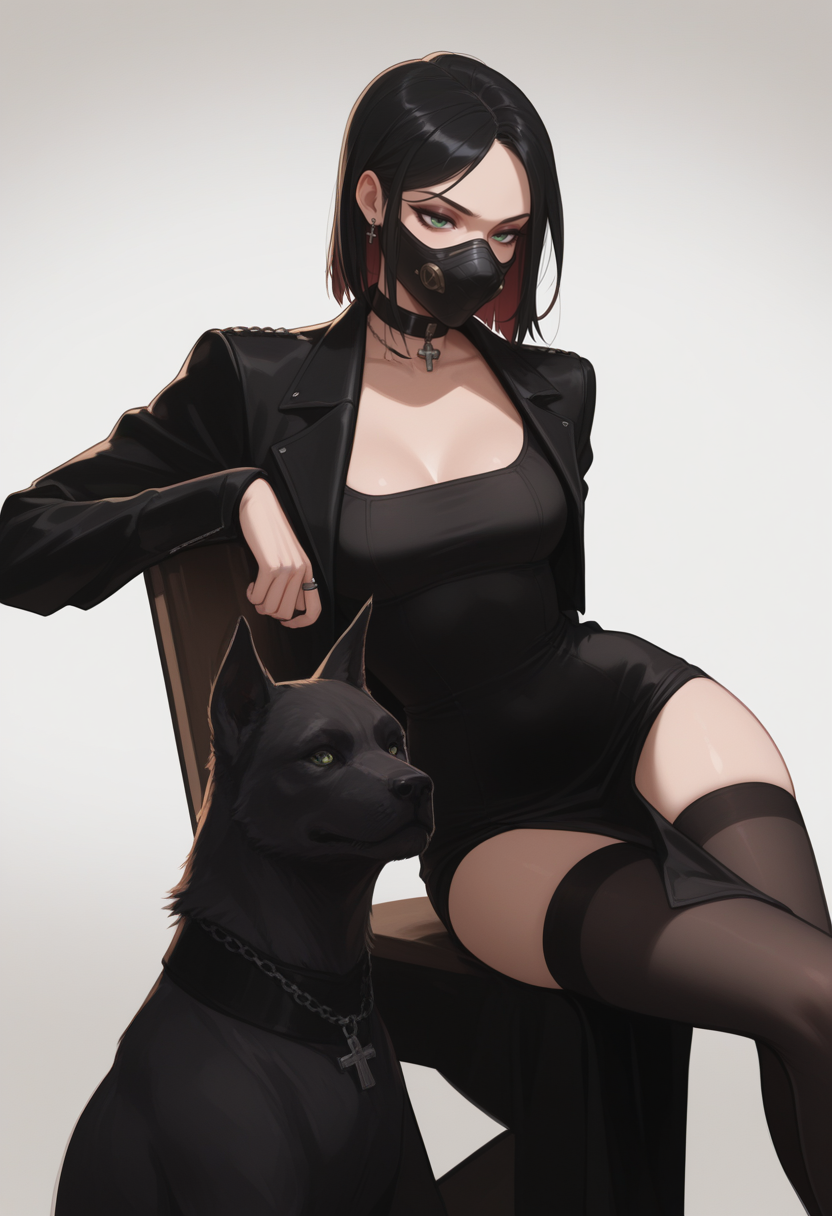 主要标签:1girl,solo,绿眼睛,短发,黑发,头发在耳后,胸部,中等胸部,面罩,口罩,紧身衣,绿色紧身衣,手套,黑色手套,过膝靴