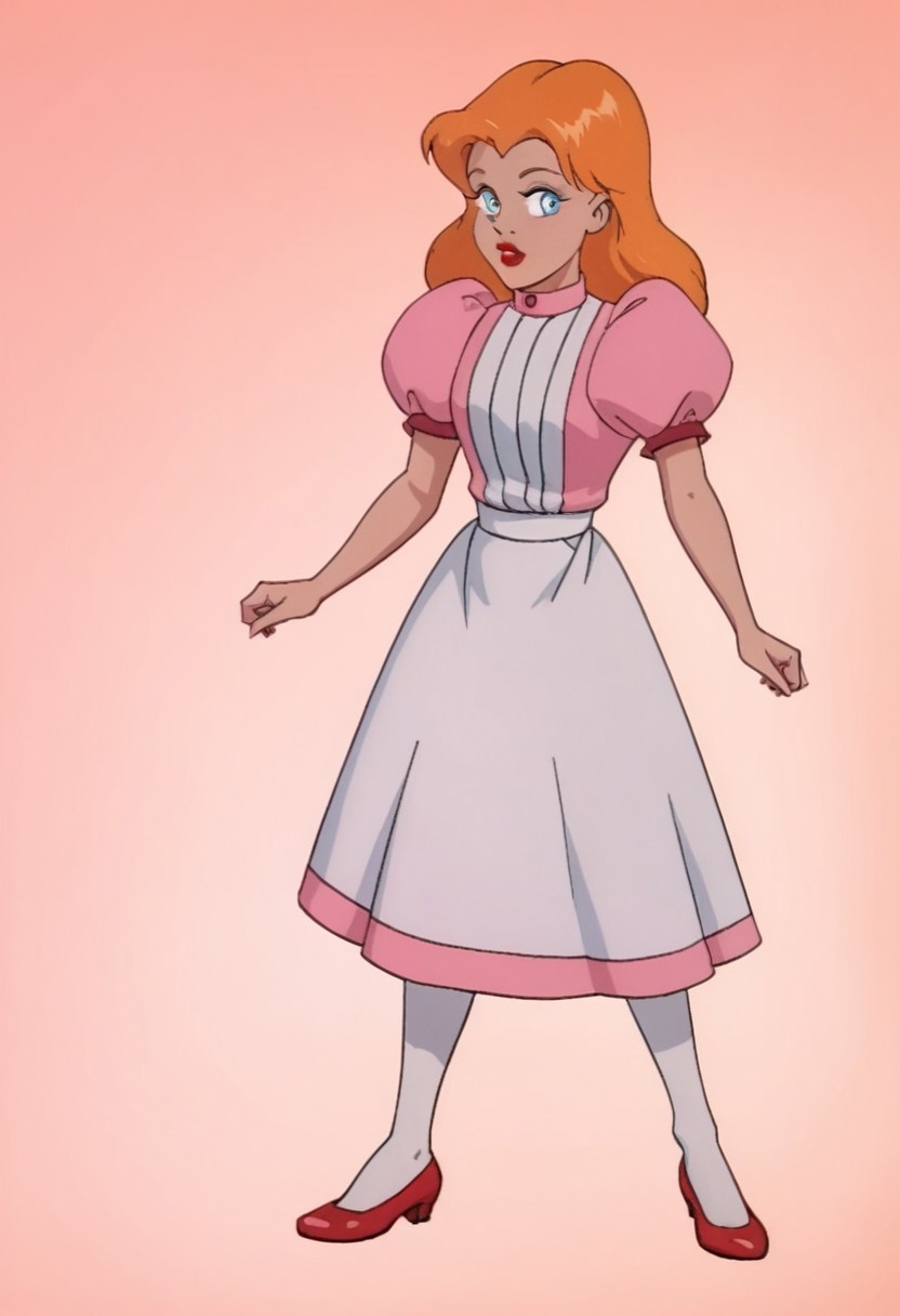 puffy sleeves, puffy short sleeves, short sleeves, dress, pink dress, apron, white pantyhose, pantyhose, skirt, shoes, red footwear