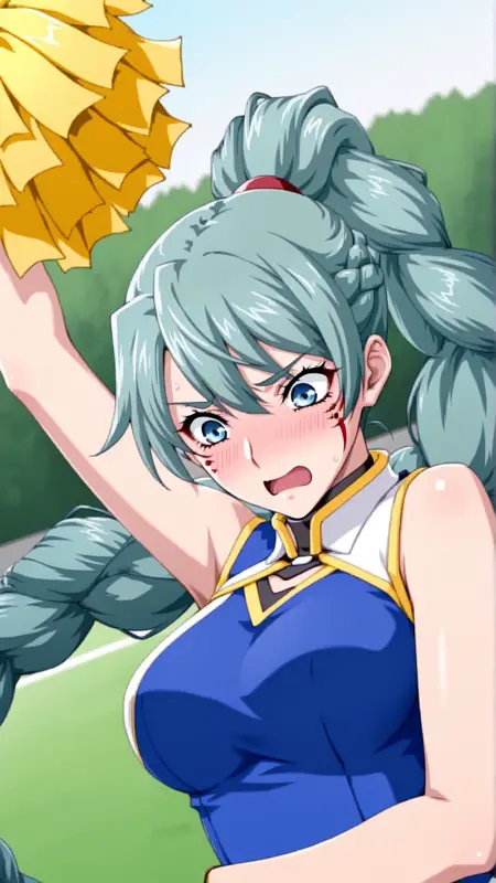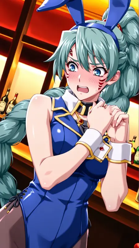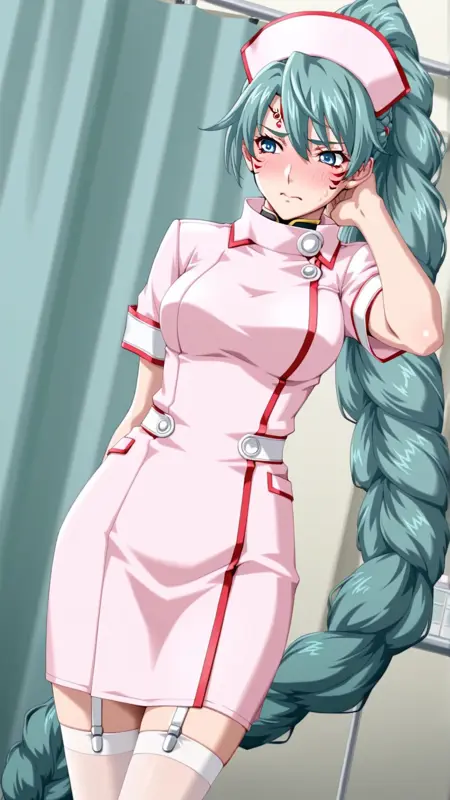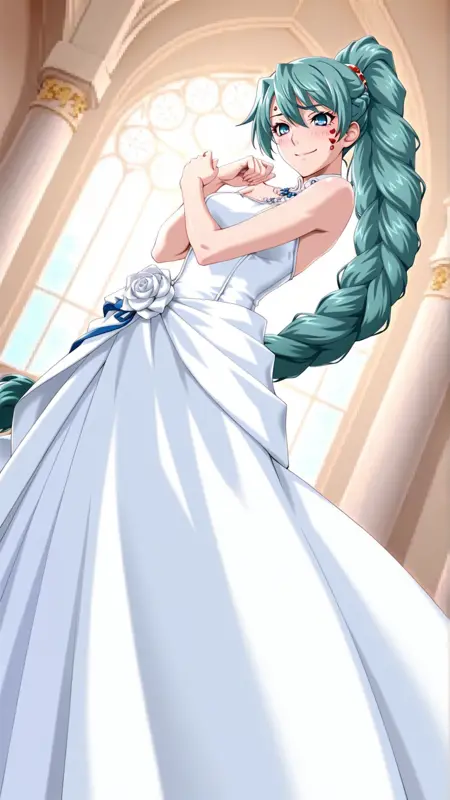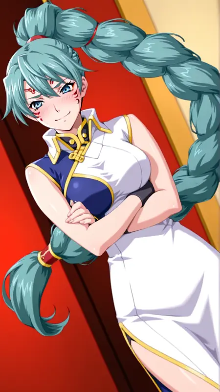 외모: 녹색 머리카락, 파란 눈, 얼굴 무늬, 땋은 머리, 매우 긴 머리카락, 땋은 폰티테일, 단일 땋은 머리,